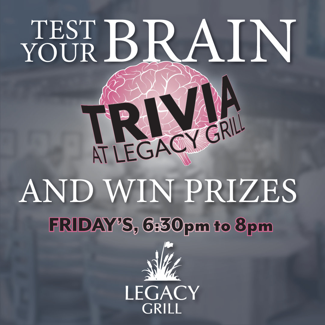 Test your brain and win prizes. Join the Cragun's Legacy Grill crew every Friday night for TRIVIA. Your host, Tim Bauman, will guide you through mind tricks, challenging questions, song lyrics and so much more. While you're at the Legacy, delight in our winter drinks, delicious food and great company. Think you have what it takes? Stop by the Legacy Grill on Fridays from 6:30pm - 8pm.