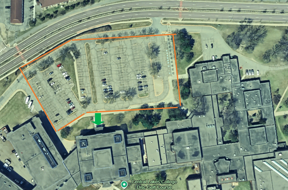 Use the North Parking Lot (ORANGE area) and enter through Door 1 (main north entrance / GREEN arrow).