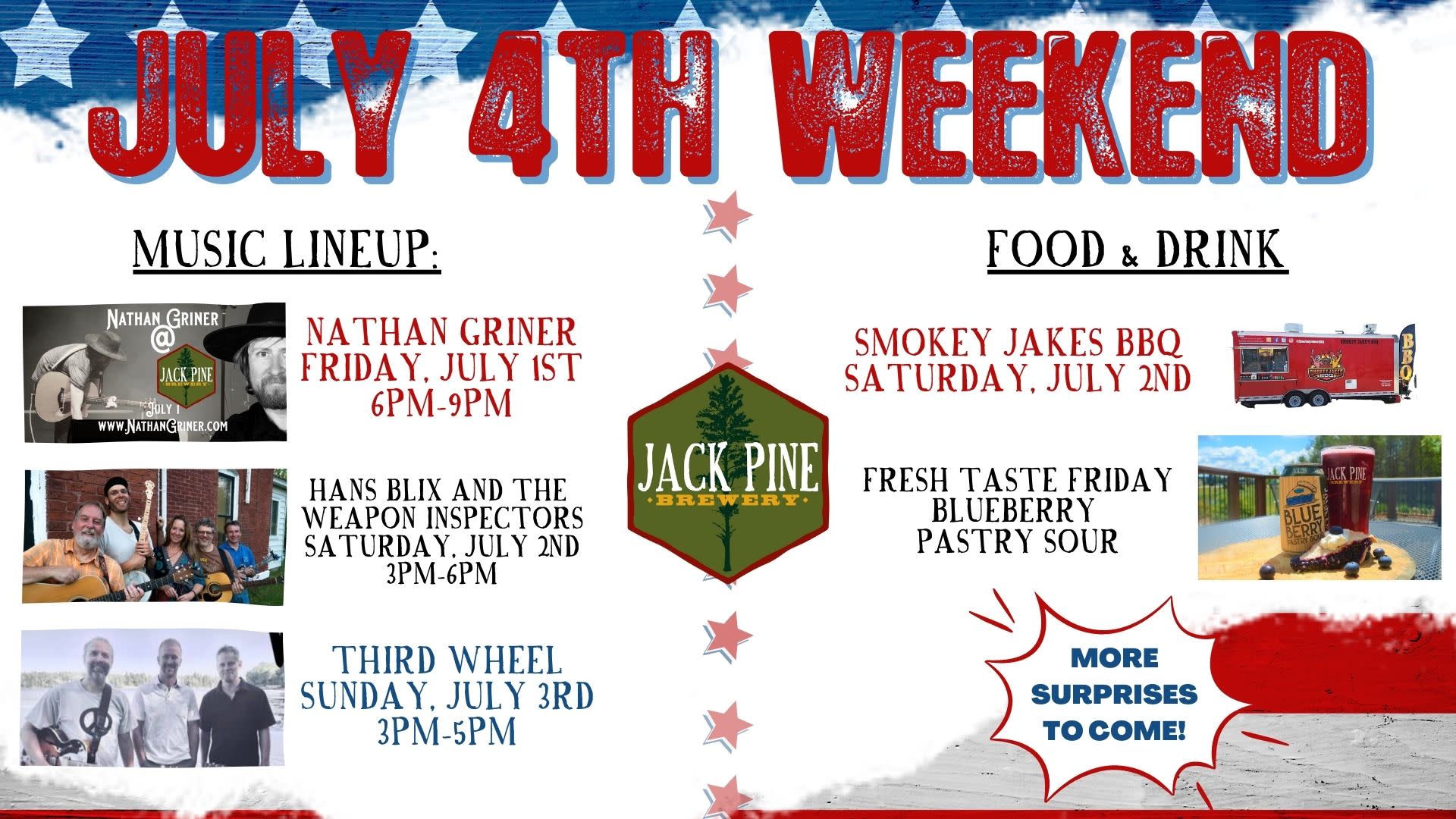 It's Independence Day, and we have quite the celebration lined up for you! Join us for live music, food trucks and maybe even a few surprises 😉 Music: Friday - Nathan Griner 6-9 Saturday - Hans Blix 3-6 Sunday - Third Wheel 3-5Additional Info