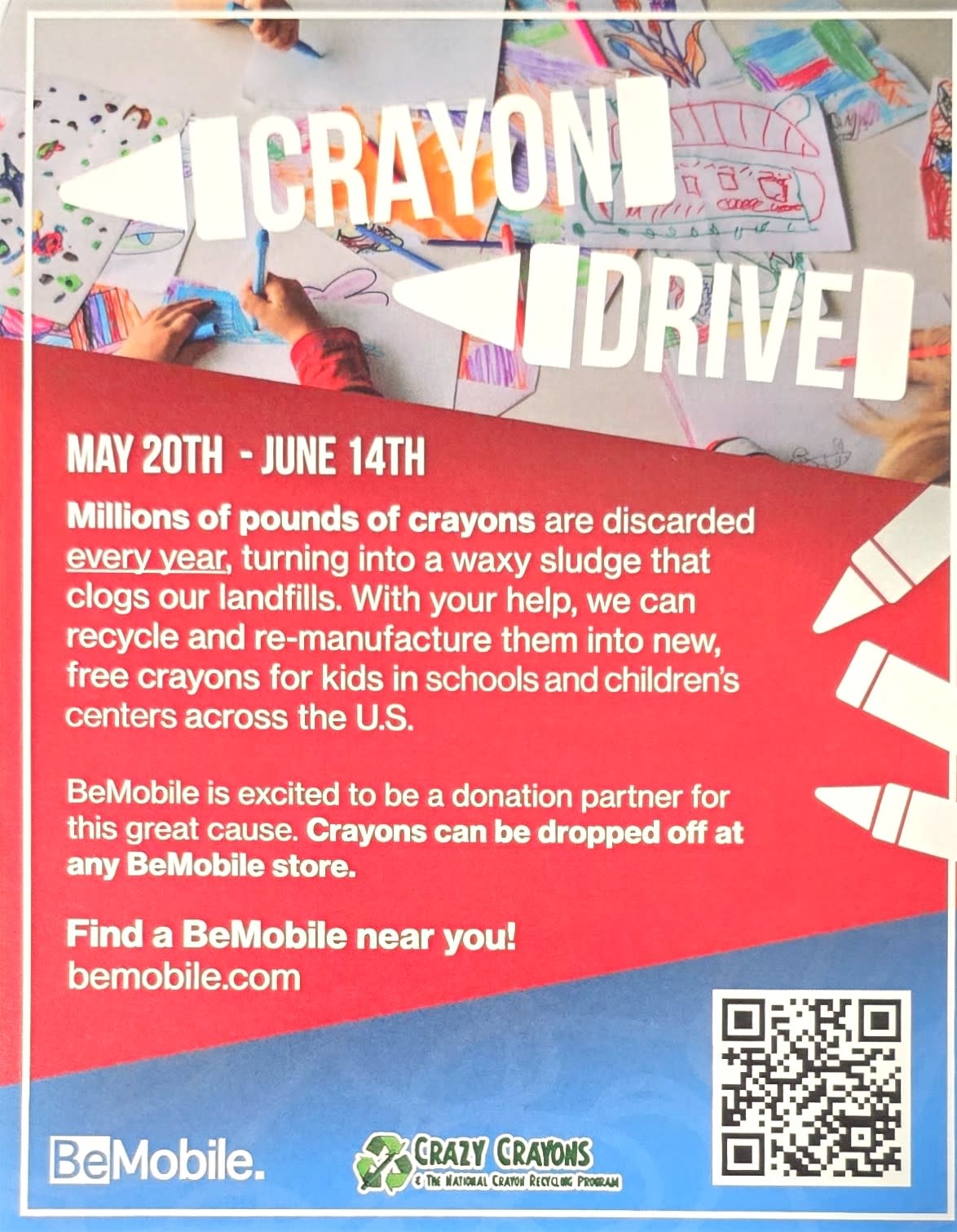 Millions of pounds of crayons are discarded every year and sent to landfills. BeMobile is excited to help collect some of those and recycle them to be given back to kids in need! Drop off your old crayons at your local BeMobile from May 20th - June 14th!