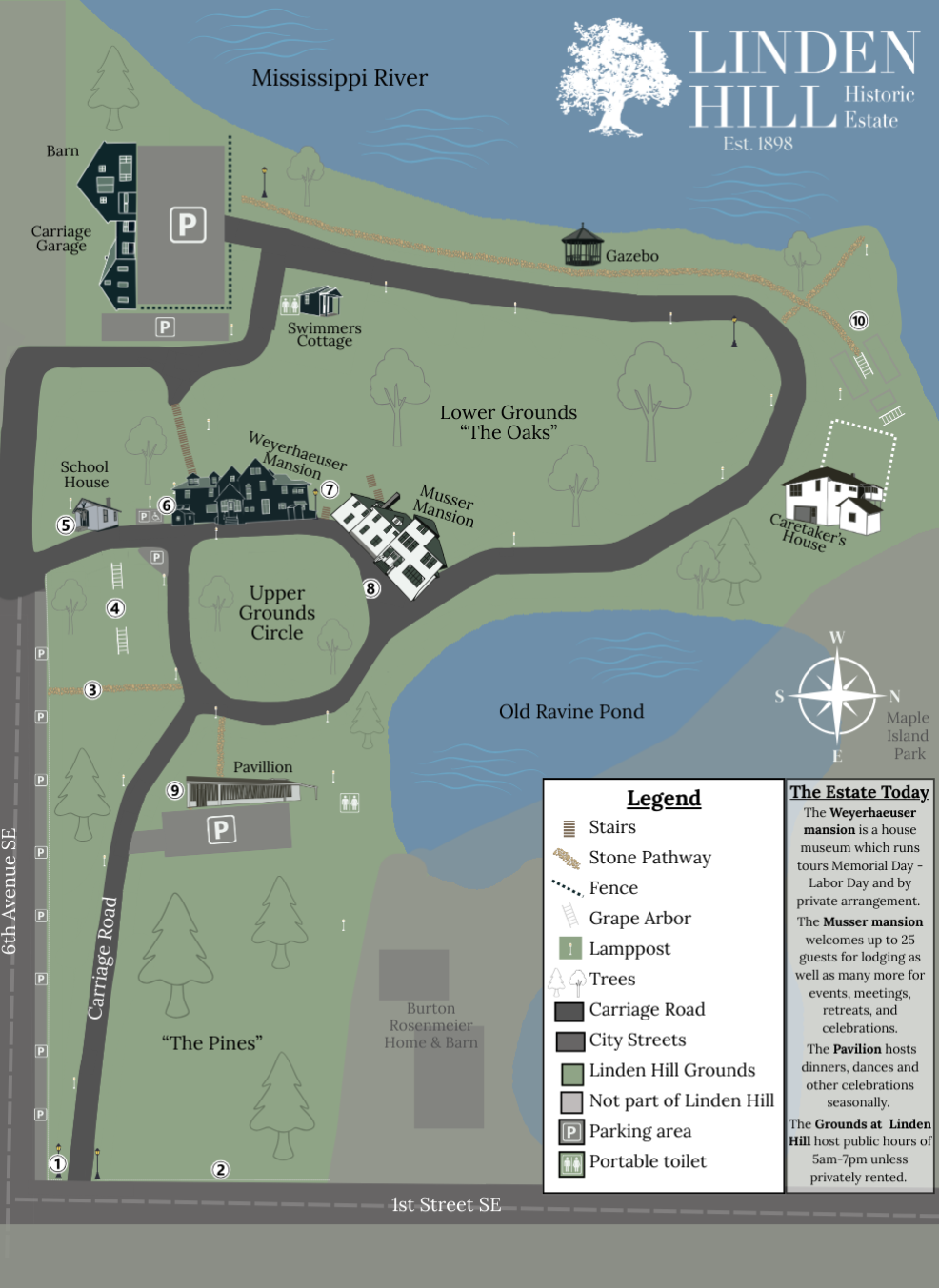 Linden Hill Historic Estate was built in 1898 on 9 acres overlooking the Mississippi River, the neighboring homes of the Weyerhaeuser (green mansion) and Musser (white mansion) families now offer the perfect historical setting for educational experiences, volunteering, special events, group lodging and more. The mansions, along with most structures on the property, are listed on the National Register of Historic Places. The estate is currently owned by the City of Little Falls and governed by a group of dedicated volunteers known as The Friends of Linden Hill. The non-profit organization was created in 2007 to preserve and protect the living and structural history, as well as the spirit of the Musser and Weyerhaeuser homes. They work to showcase the houses and their history now and for the future. Linden Hill Historic Estate provides the perfect backdrop for a memorable wedding, event and lodging.