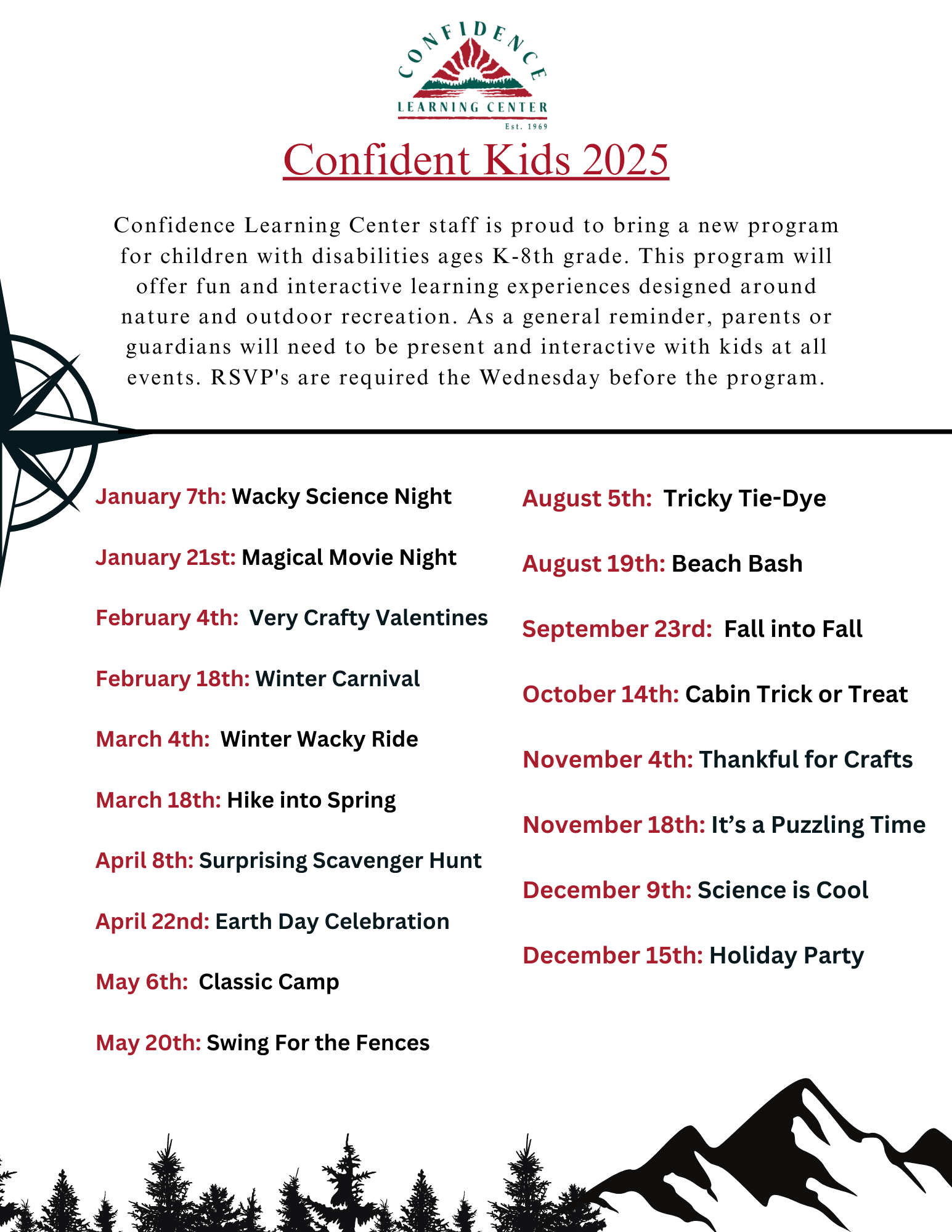 Confidence Learning Center is proud to bring a new program for children with disabilities ages K-8. The theme for tonight is 'Hike into Spring.' Please call our office at 218-828-2344 for more information, or to RSVP.Additional Info