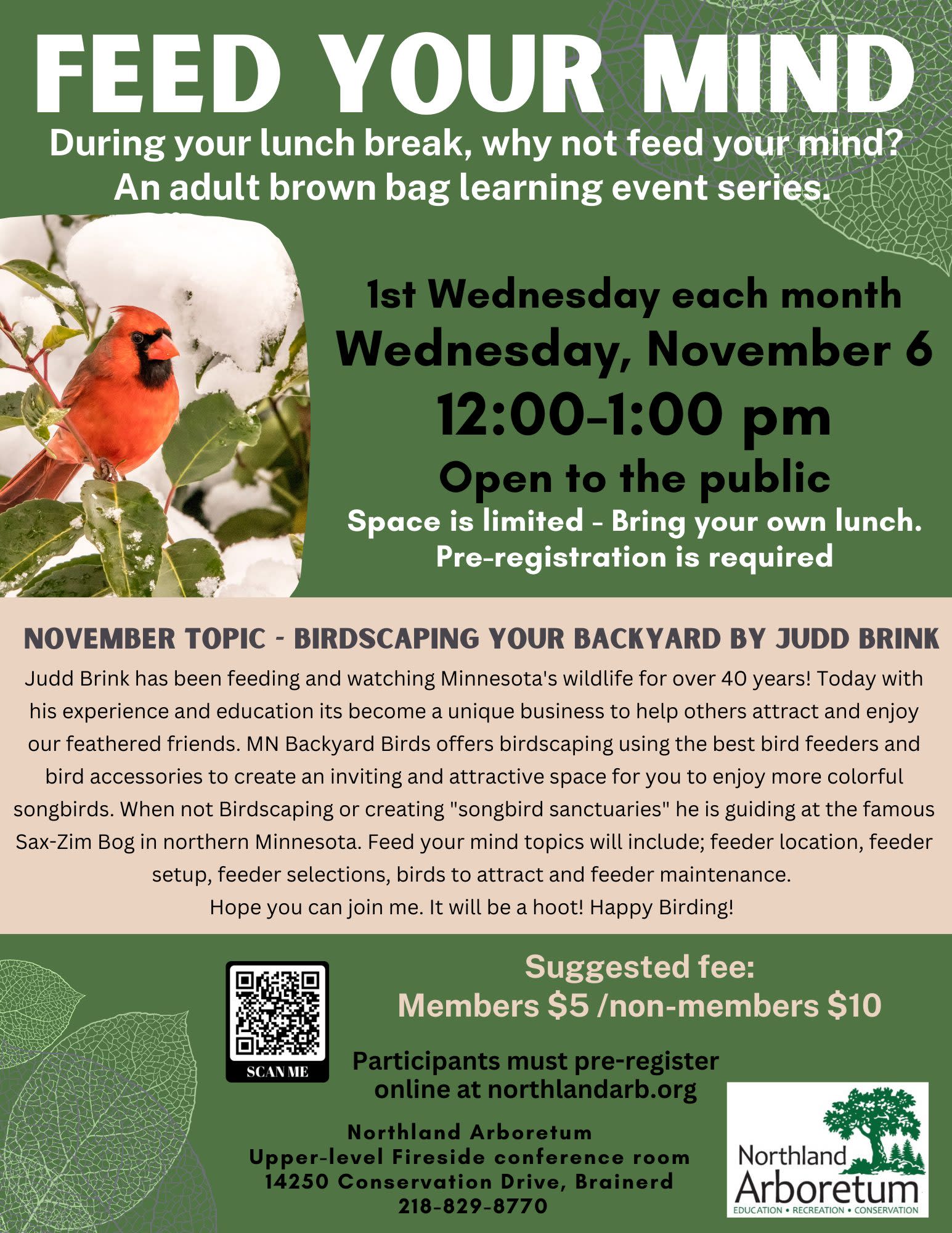 Judd Brink has been feeding and watching Minnesota's wildlife for over 40 years! Today with his experience and education its become a unique business to help others attract and enjoy our feathered friends. MN Backyard Birds offers birdscaping using the best bird feeders and bird accessories to create an inviting and attractive space for you to enjoy more colorful songbirds. When not Birdscaping or creating "songbird sanctuaries" he is guiding at the famous Sax-Zim Bog in northern Minnesota. Feed your mind topics will include; feeder location, feeder setup, feeder selections, birds to attract and feeder maintenance.