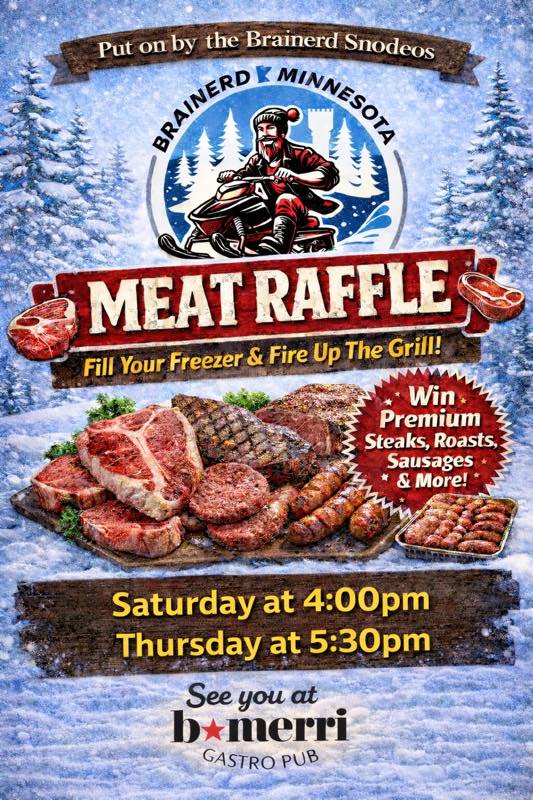 Join us every Saturday starting at 4:00 for Meat Raffle! 🍗🥩🥓 At b*merri Gastropub, sponsored by The Brainerd Snodeos Snowmobile Club