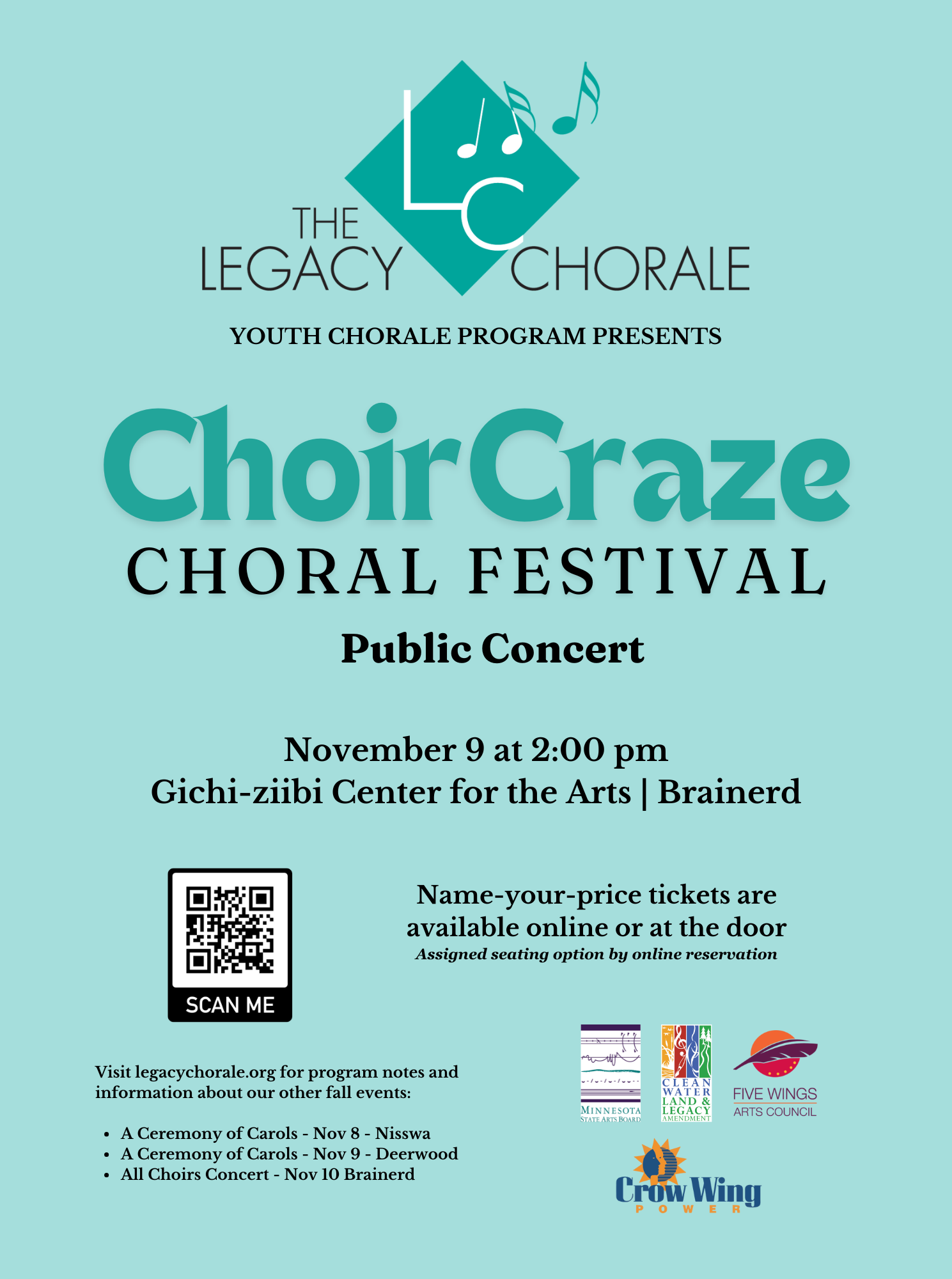 Choir Craze is a one day festival hosted by the Legacy Youth Chorale. Singers from around the Brainerd Lakes Area are invited to come together to workshop music and perform in the finale of a public concert at the Gichi-ziibi Center for the Arts. The concert begins at 2:00 pm and includes the Legacy Youth Chorale’s fall program, concluding with a performance by the entire festival choir. The program explores poignant text, using imagery of light throughout to communicate feelings of warmth, comfort, and joy.