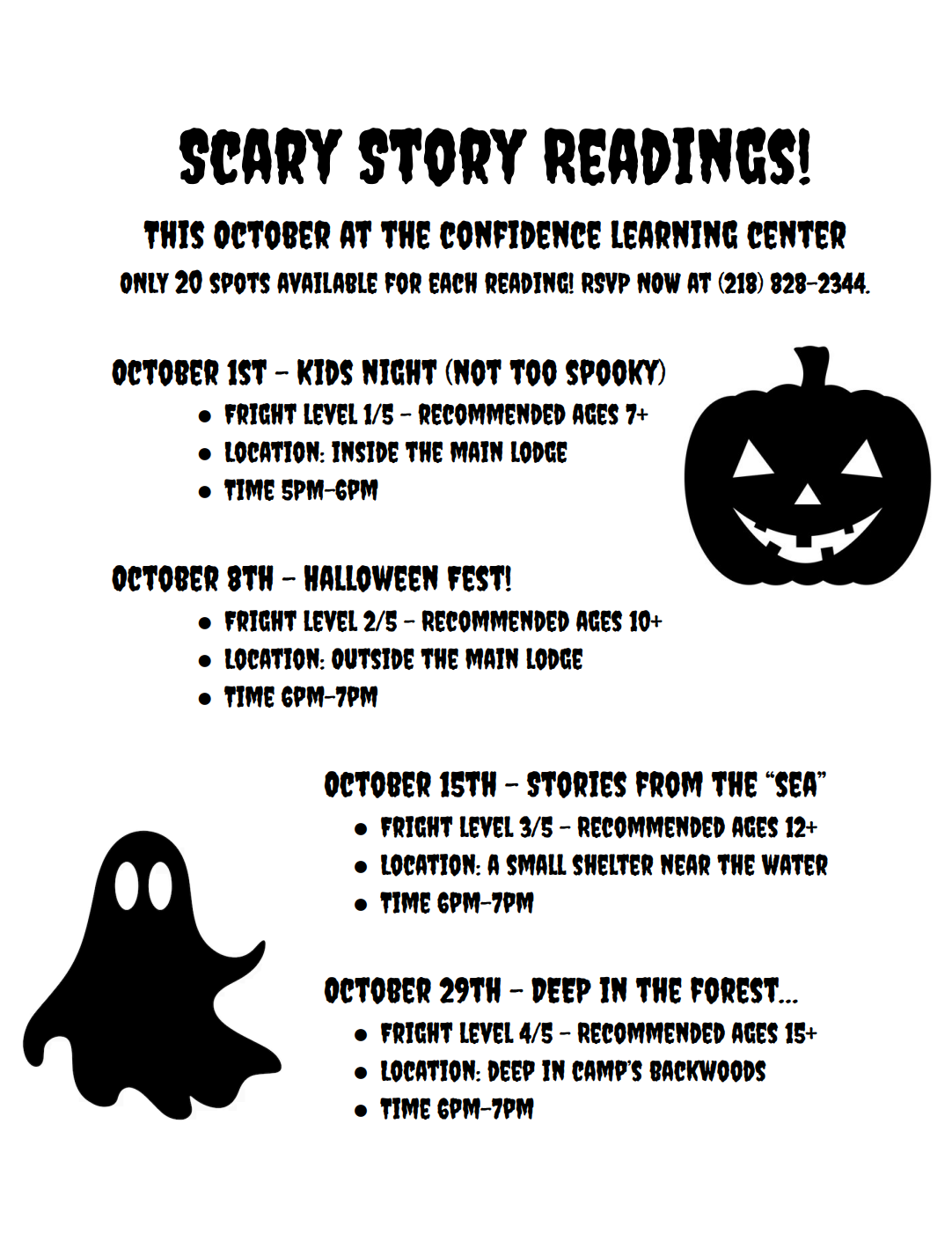 October 8th - Halloween Fest! Fright Level: 2/5 (recommended ages 10+) Join us outside our main lodge for a night of scary stories! Open to our Confident Kid campers!