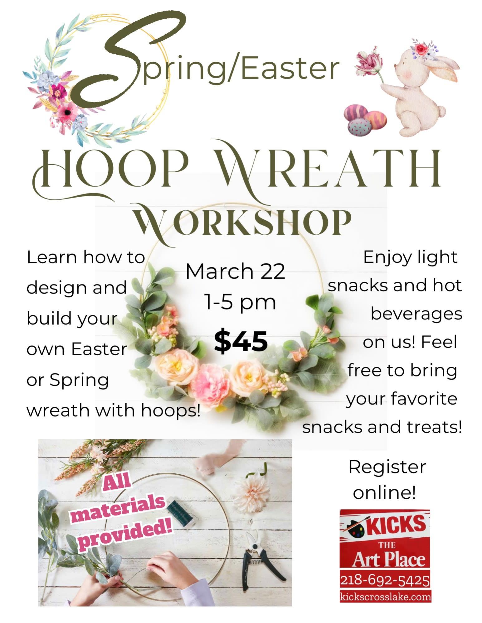 Register at the link: https://kickscrosslake.com/event/spring-easter-hoop-wreath-workshop/