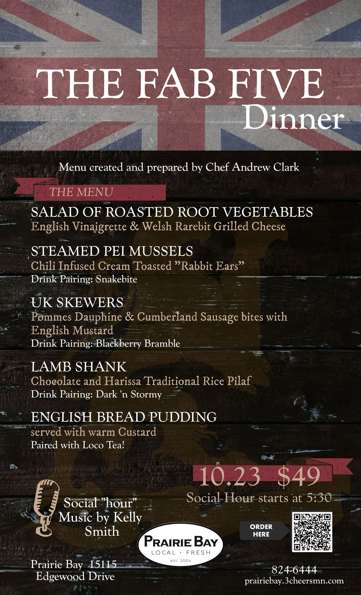 Join us on October 23rd for a British Inspired Dinner at Prairie Bay. Four great courses, three amazing drink pairings, one awesome experience from Chef Andrew Clark.Additional Info