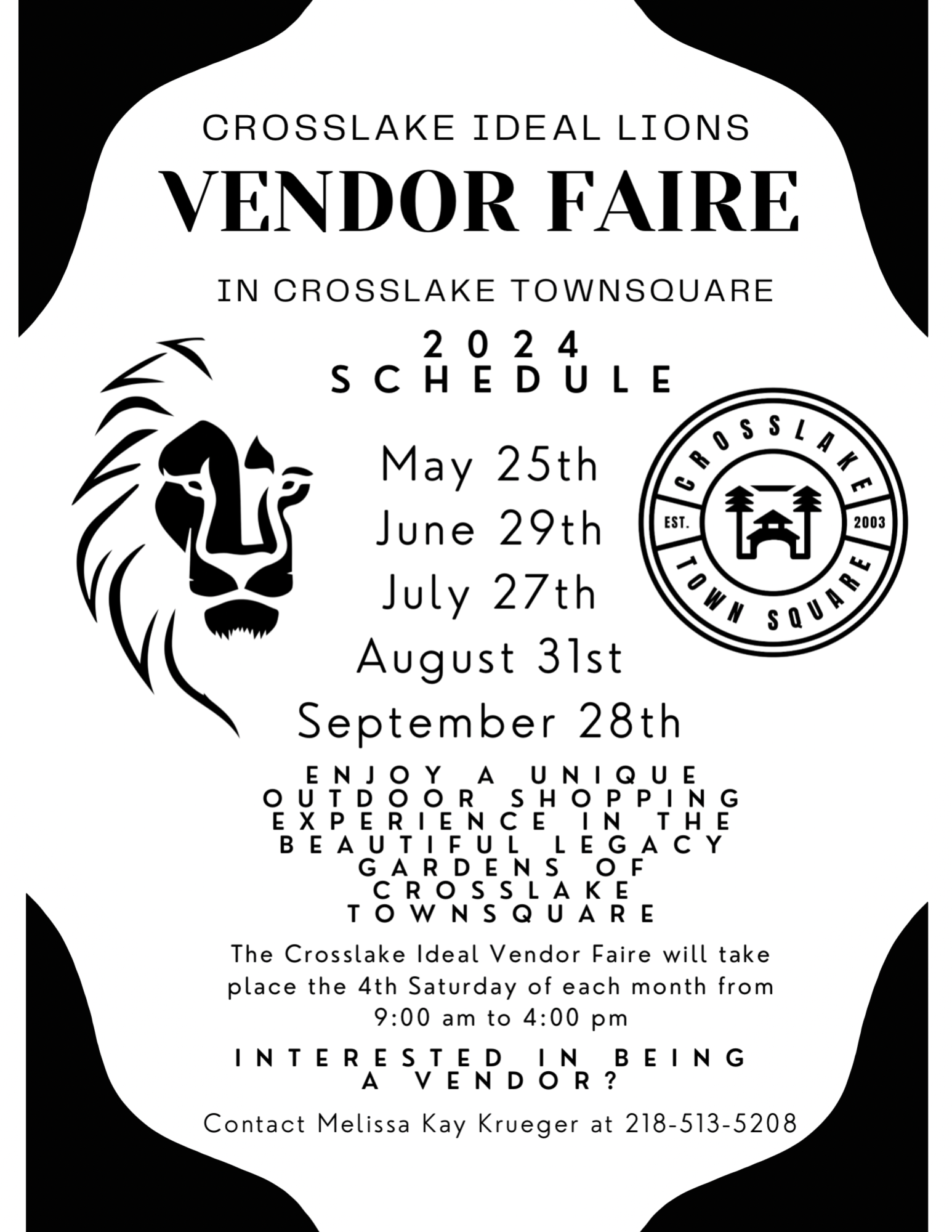DESCRIPTION:Enjoy a unique outdoor shopping experience  in the beautiful Legacy Gardens of Crosslake Town Square. The Crosslake Ideal Lions Vendor Faire will take place the 4th Saturday of each month from 9 a.m. to 4 p.m. in Crosslake Town Square. Vendors - Contact Melissa Kay Krueger at 218-513-5208 to participate.